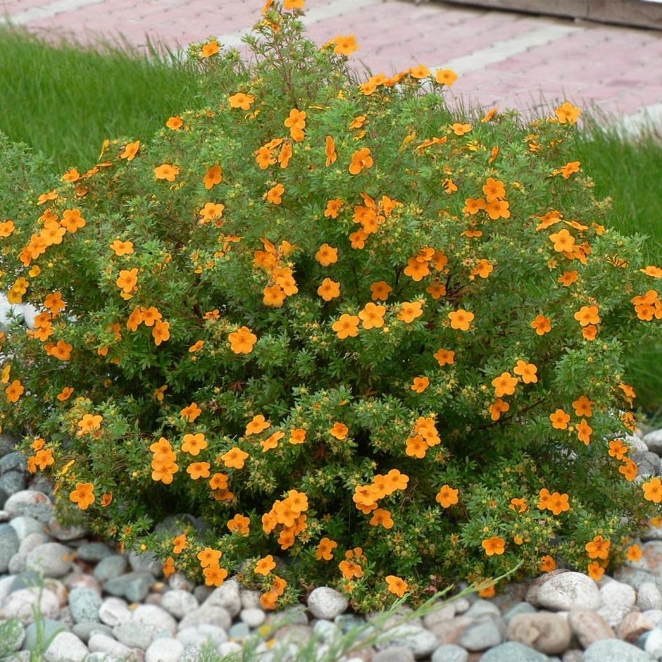 Лапчатка Манго Танго - низкий, красивоцветущий кустарник высотой до 0,6 м, с плотной, аккуратной, компактной, подушковидной кроной, перистыми серо-зелеными листьями. Цветет обильно и продолжительно до самой поздней осени. Цветки крупные, двуцветные оранжево-красные с яркой желтой серединой. В прохладную погоду обычно цветки более красные.