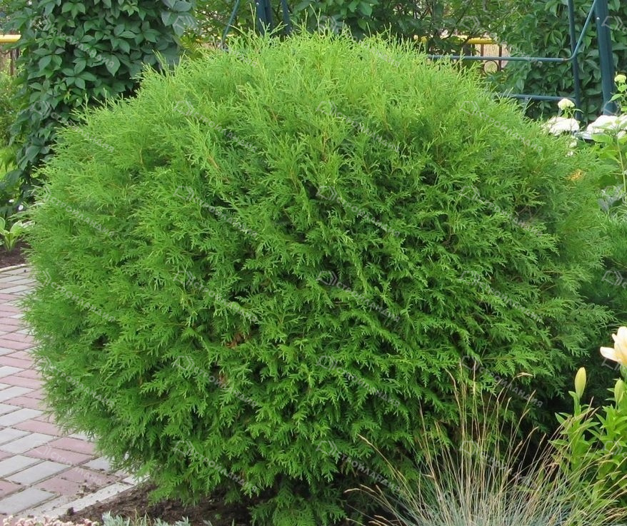 Туя западная Глобоза – карликовая форма туи западной, достигает 1,5 м высотой и около 1,5 м шириной. Форма кроны округлая. Растет быстро. В 10 лет более 1 м в ширину. Старые экземпляры часто теряют компактную сферическую крону. Побеги прямые и плоские, подняты вверх, густо расположены, перекрывающиеся, равномерно разрастающиеся в стороны. Хвоя чешуевидная, светло-зеленая весной, зеленая летом и серо-зеленая или коричневатая зимой, с блестящими железками.